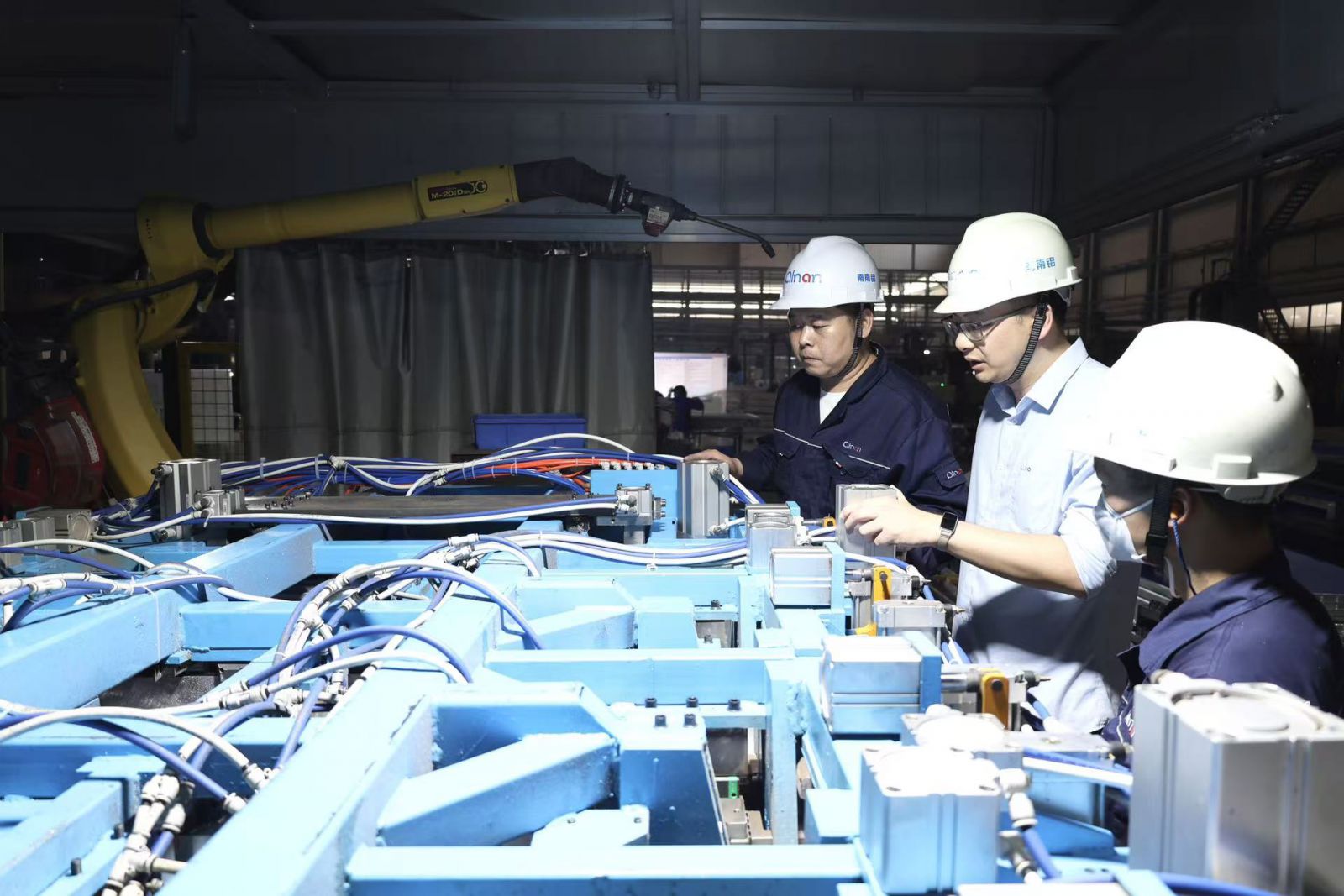 莫凯(右一)指导新员工操作机器人CNC工作台