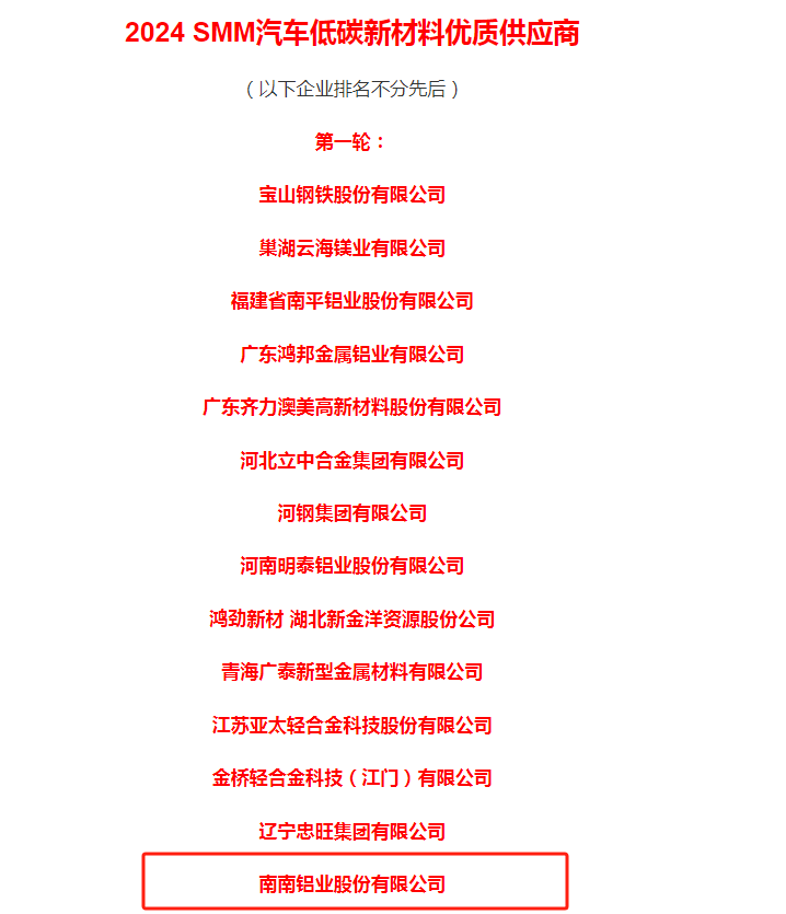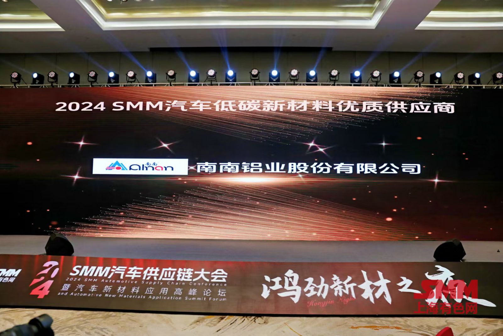 近日,在由上海有色网信息科技股份有限公司(SMM)、上海有色金属行业协会、苏州市压铸技术协会主办的2024 SMM汽车供应链大会暨汽车新材料应用高峰论坛颁奖仪式上,南南铝业股份有限公司荣获“2024 SMM汽车低碳新材料优质供应商”。