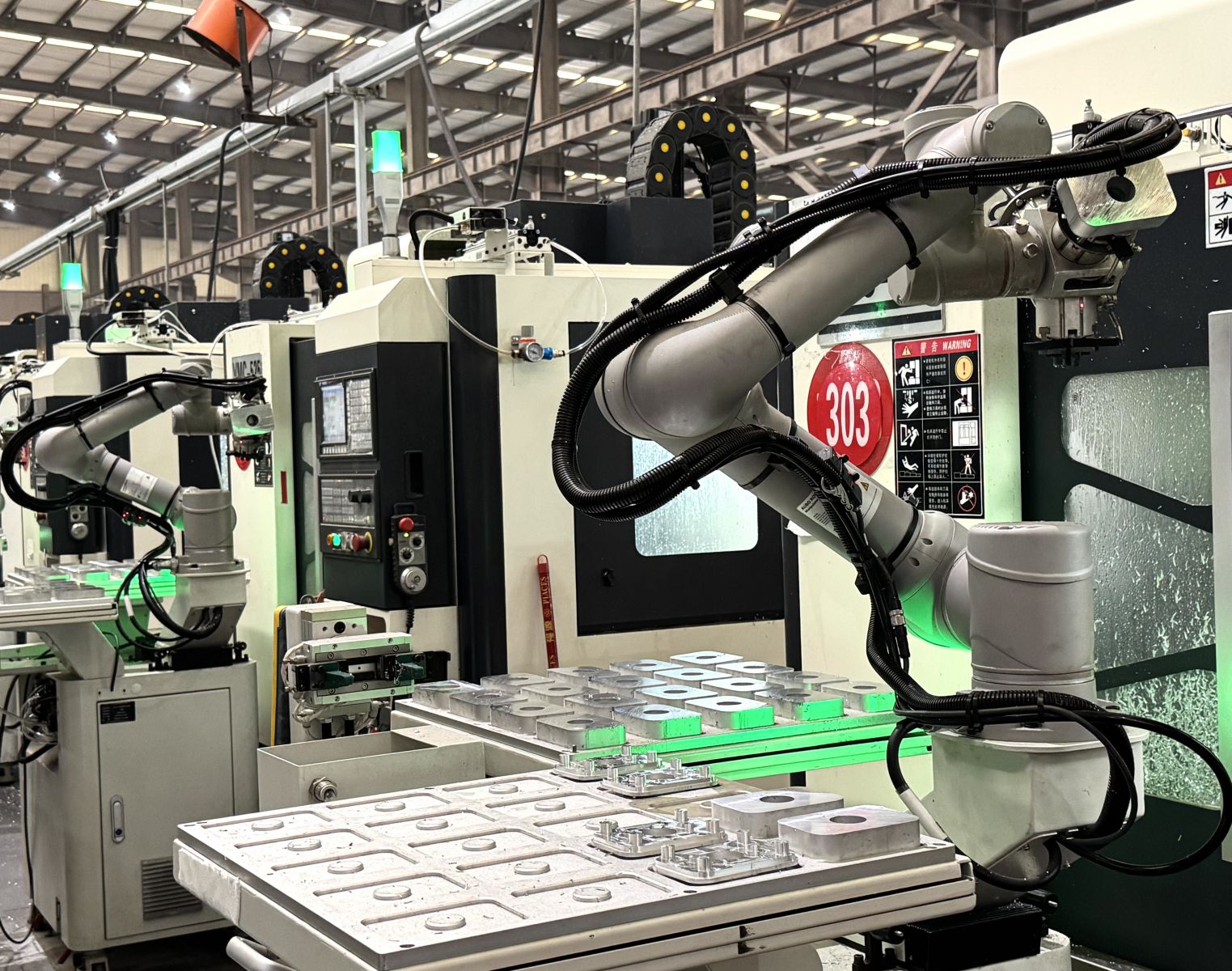 此次机器人CNC工作站采用“1拖5”作业模式,实现单人同时操控5套机器人CNC工作站,相比传统人工搬运装夹,大幅降低劳动强度,让员工转向设备监控、质量管控等关键岗位,实现人机高效协同。